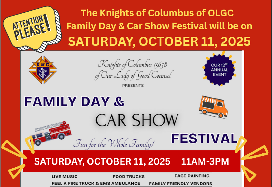 12th Annual Family Day & Car Show- Ken Gioffre memorial – Saturday, October 11th – OLGC Parish Parking Lot